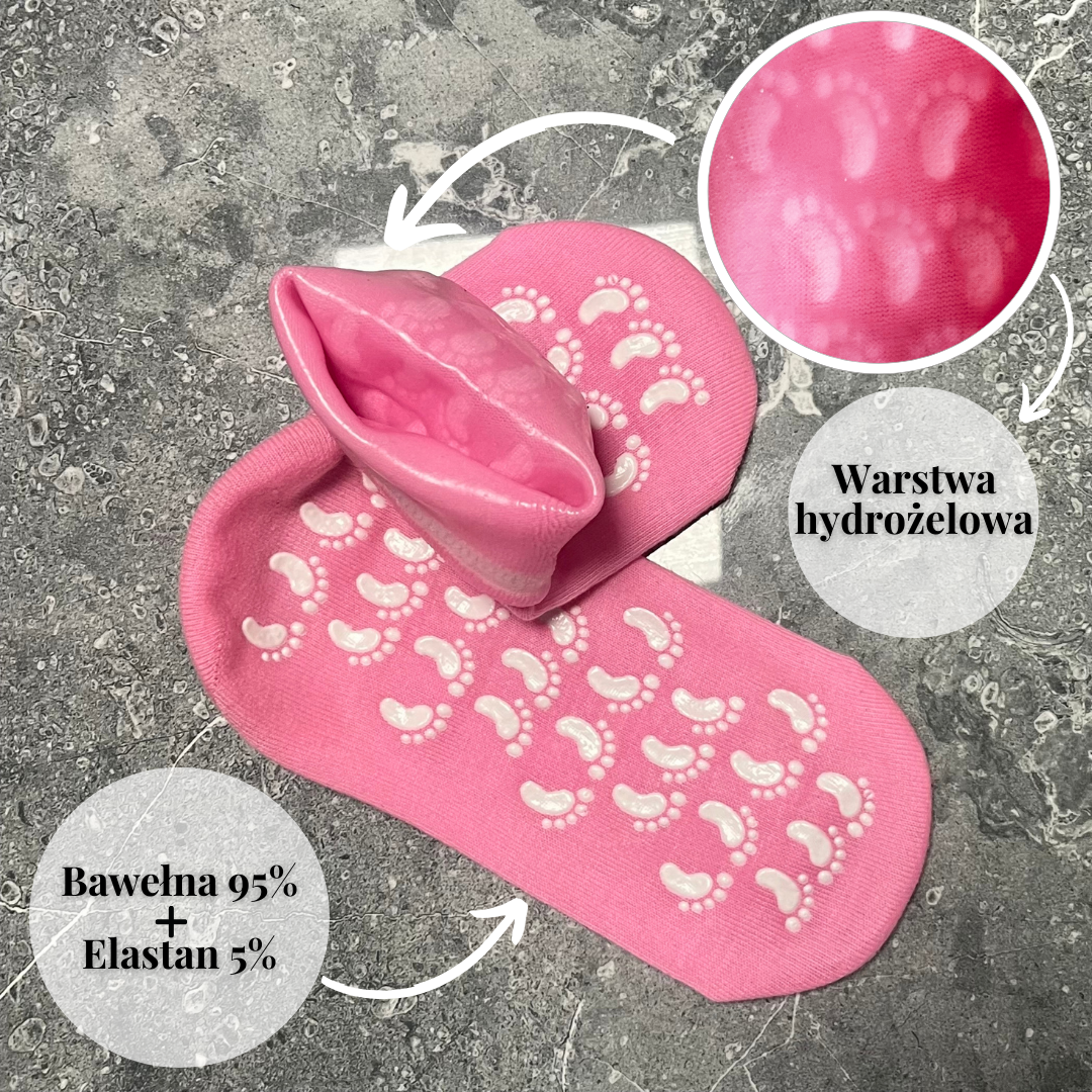 Wewnętrzna hydrożelowa warstwa intensywnie nawilża i regeneruje skórę stóp, szczególnie w okolicach pięt, pomagając w walce z suchą i popękaną skórą.